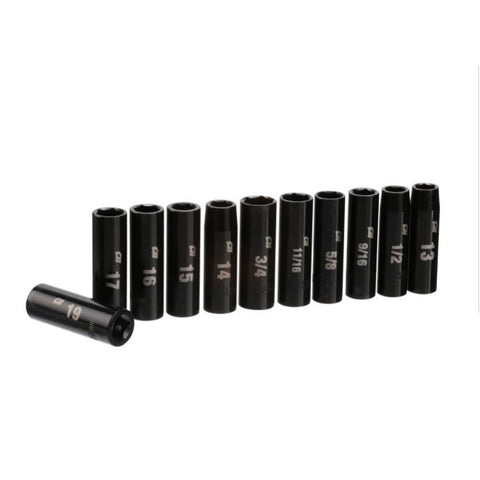 The Campbell Hausfeld 3/8-inch, deep-drive impact socket set (AA000010) is made of high-strength chrome-vanadium steel to stand up to the toughest impact wrench jobs. The laser-etched design allows easy identification of sockets, which include sizes 1/2-inch, 9/16-inch, 5/8-inch, 11/16-inch and 3/4-inch, plus metric sizes 13 mm, 14 mm, 15 mm, 16 mm and 19 mm. Includes a hanging storage case to keep sockets organized.