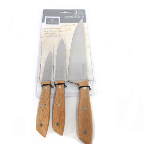 Tackle meal prep with the pieces in this Gibson Home Seward Cutlery Set. This 3-piece set features sharp and strong stainless-steel blades, while the triple-riveted wood handles offer a comfortable grip and a timeless appearance.