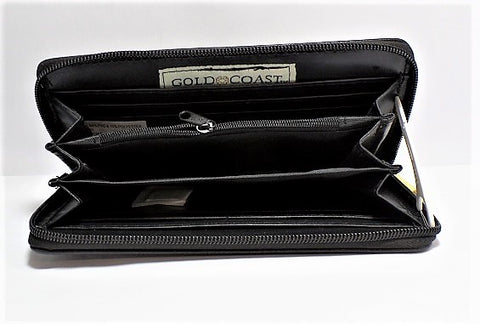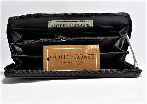 This women's fashion wallet by Gold Coast features a faux leather in black with a gold colored detailing. The wallet has 8 credit card compartments, a bill compartment, zippered coin pocket and a long zip around closure. Measure 8"L x 4" H.