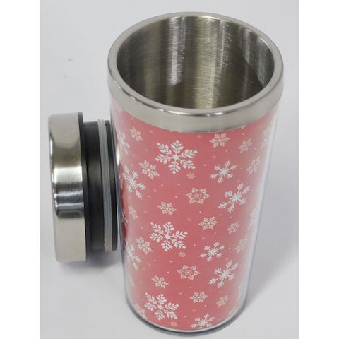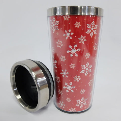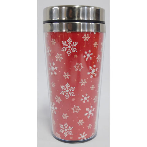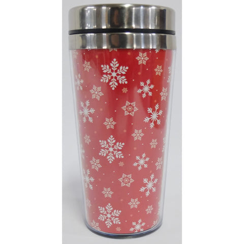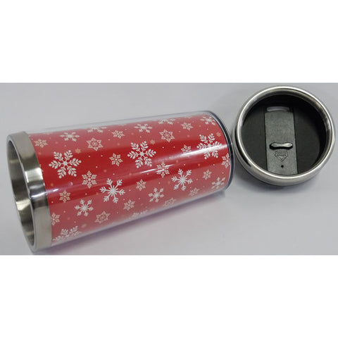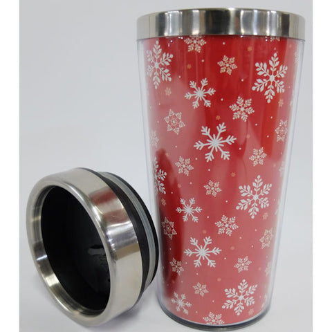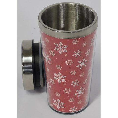 Enjoy your beverage at home and on the road with this winter themed travel mug. The mug is lined in red with white snowflakes with a black lid and stainless steel trim.