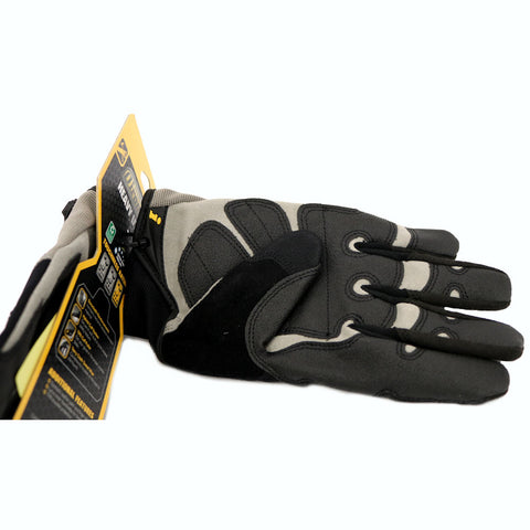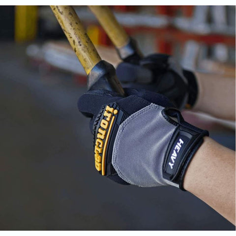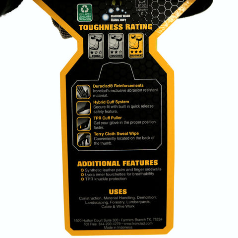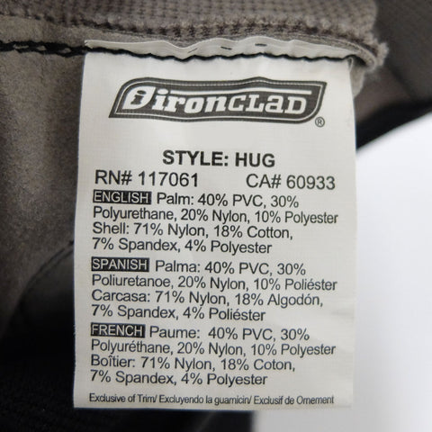 The Ironclad HUG is a heavy utility glove that features a washable breathable abrasion resistant material with a synthetic leather palm and finder sidewalls. The Hybrid cuff system provides a secure fit with a built in quick release saftey feature. The TPR cuff puller allows you to get your glove in the proper position faster and the gloves have a terry cloth sweat wipe conveniently located on the back of the thumb. These gloves are machine washable, the manufacturer recommends hang drying. Recommended for use in construction, material handling, demolition, landscaping, forestry, lumber yards or cable and wire work. The gloves are a size medium (Palm width: 3 - 3 3/8 in) and come with the "toughest" in toughness ratings.