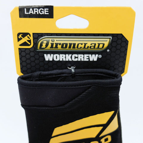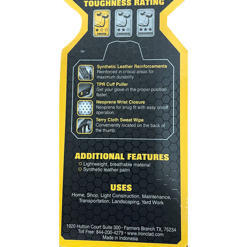 The Workcrew is the perfect all-around light duty glove. A value glove with the function and protection you expect from Ironclad. The ergonomically designed Workcrew gloves feature a durable synthetic leather palm and benefit from Ironclad’s exclusive 16-point measurement system for best-in-class performance fit with a No bulk feel. The terry cloth on the back of thumb can be utilized to wipe the sweat away while staying focused on the task at hand. When the job is complete and the day is at an end these gloves can be tossed in the washer as they will not dry out or shrink when washed. The gloves are a size Large (Palm width: 3-3/8 - 3 7/8 in) and come with the "tough" in toughness ratings.