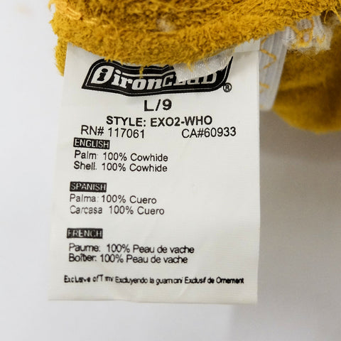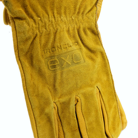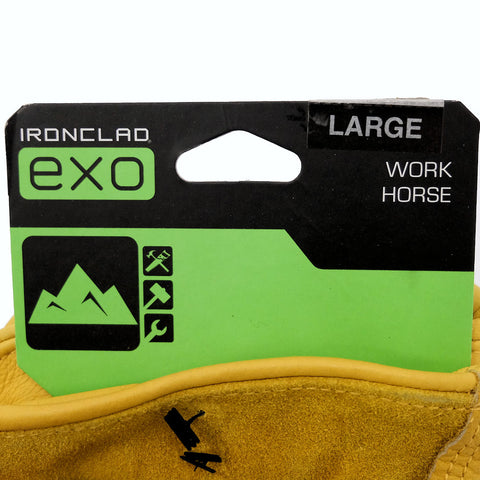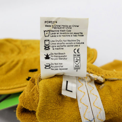 The Ironclad Workhorse work glove features an elastic wrist cinch that creates a secure fit while allowing an easy on/off. The grain cowhide palm provides excellent grip and durability while the split cowhide back of hand provides flexibility and protection. This glove can be used for a variety of applications such as ranch work, landscaping, DIY projects, industrial and masonry. These gloves are a men;s size Large (palm width 3-3/8-3-7/6 in). These gloves are machine washable, the manufacturer recommends hang drying.