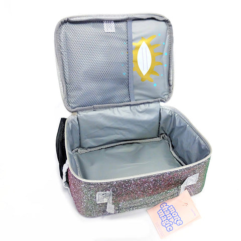 For a lunchbox as glittery as their personality, they'll love the Multi Glitter Canvas Lunch Tote from More Than Magic™. The silver lunchbox has a standout look, with black, teal and silver glitter all over. Hints of pink glitter speckled throughout add just the right touch of extra color. The glitter lunchbox features plenty of space for their lunch and snacks — there's a roomy main compartment with mesh pocket, an outer zip pocket and even a water bottle pocket — and it's insulated to make sure cold items stay cool until lunchtime. A handle on top makes it easy for them to carry, whether they're headed to school or a practice. Dimensions (Overall): 7.5 Inches (H) x 9.5 Inches (W) x 4 Inches (D)