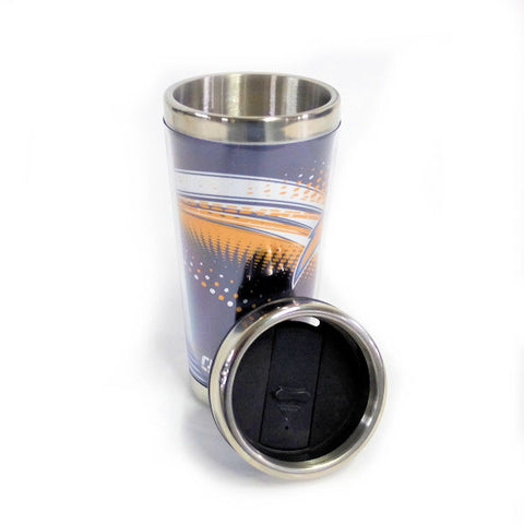 Dual-walled Construction. Features spill proof lid. Keeps Liquids hot or cold for hours. 100% BPA free. Full Wrap insert to highlight team's logo. Lid has slide lock to cut sown on spills.