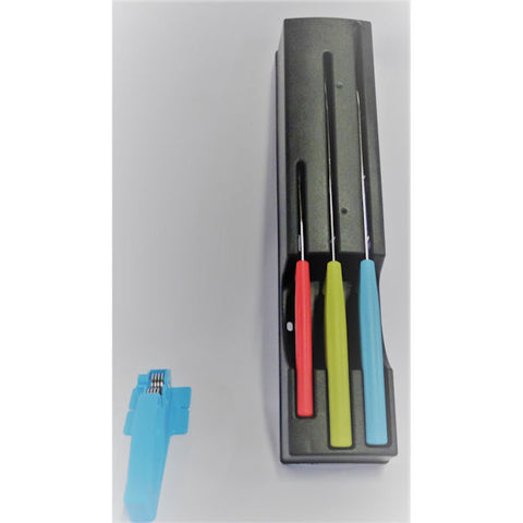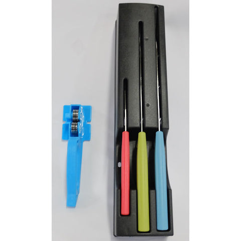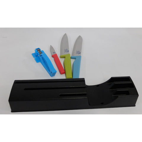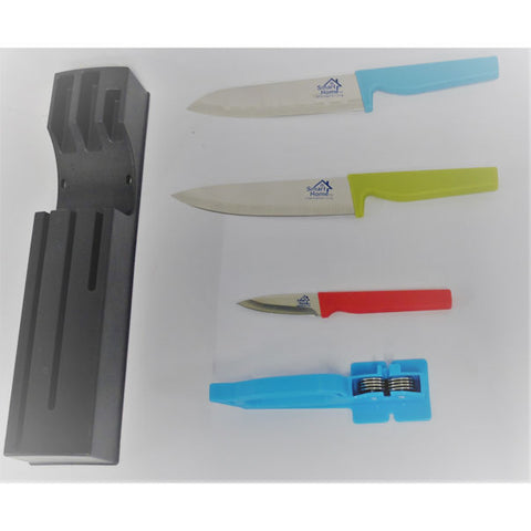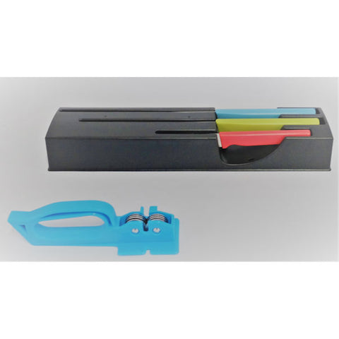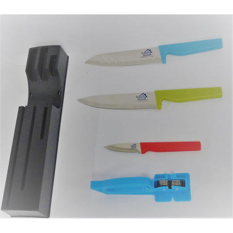 - Set Includes:One Chef Knife, One Santoku Knife, One Paring Knife, One Sharpener and One Plastic Block