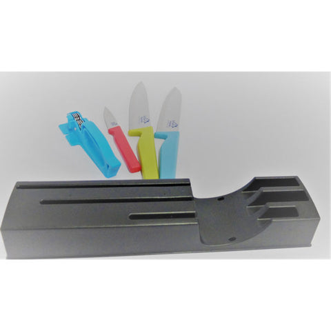 - 7 inch Chef's Knife, 7 inch Santoku Knife, 3.5 inch Paring Knife, 7 inch Sharpener and 14 inch Block