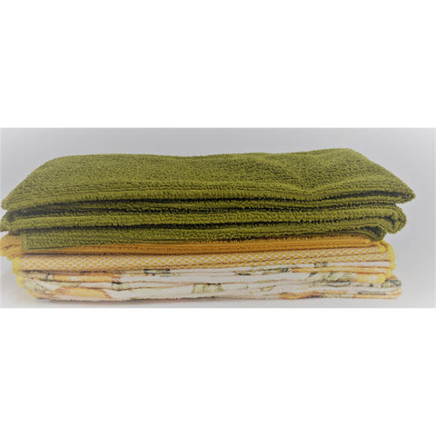 This set includes 6 Kitchen Towels measuring 15” X 25” , and 9 washcloths measuring 12" x 12".Machine Wash Cold. 100% Polyester