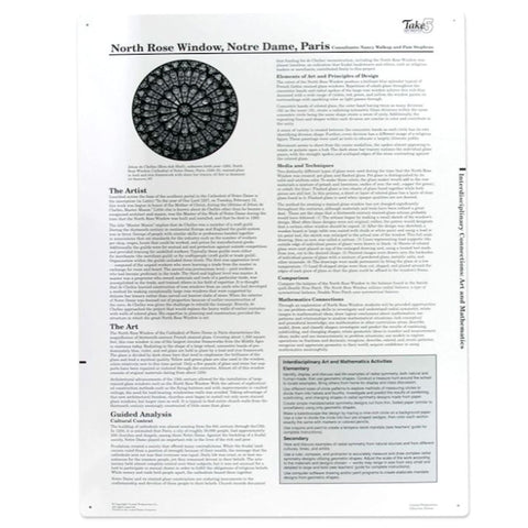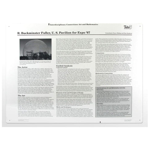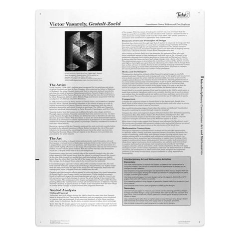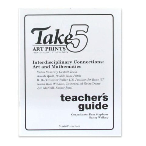 Crystal Productions Take 5 Art Prints is a series of fine art prints, printed on sturdy cardboard, laminated on both sides and ready to handle or display. Each themed set of five 18" × 24" (46 cm × 61 cm) reproductions comes in a plastic portfolio. On the back of each print is a statement about the artist and the art, and a guided analysis with questions and information providing background for classroom teachers to lead classroom discussions. A teacher reference guide is also included. On the back of each print is a black and white reference reproduction of the artwork and text divided into the following areas: The Artist, The Art, Cultural Context, Elements of Art and Principals of Design, Media and Techniques, Comparisons, Language Arts Connections, Language Arts Activities, Vocabulary, Resources.