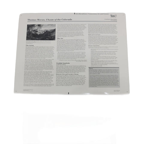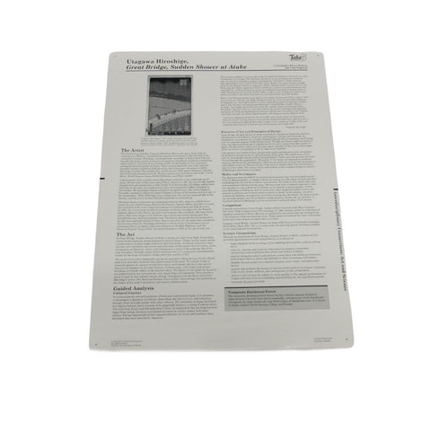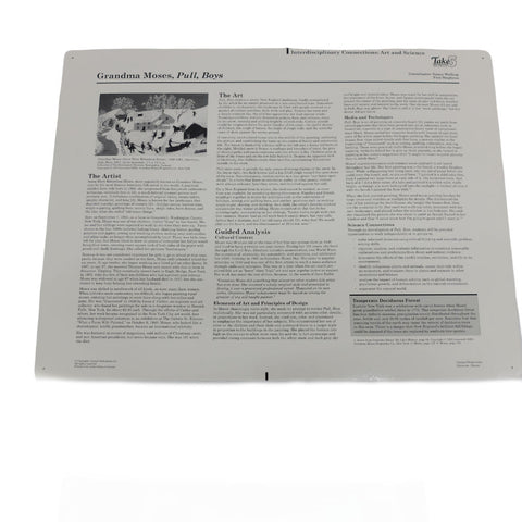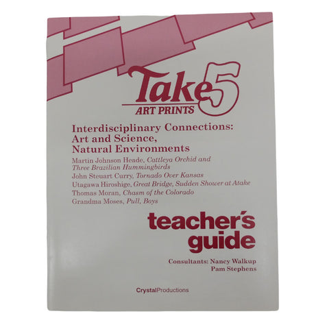 Crystal Productions Take 5 Art Prints is a series of fine art prints printed on sturdy cardboard, laminated on both sides and ready to handle or display. Each themed set of five 18" × 24" (46 cm × 61 cm) reproductions comes in a plastic portfolio. On the back of each print is a statement about the artist and the art, and a guided analysis with questions and information providing background for classroom teachers to lead classroom discussions. A teacher reference guide is also included. On the back of each print is a black and white reference reproduction of the artwork and text divided into the following areas: The Artist, The Art, Cultural Context, Elements of Art and Principals of Design, Media and Techniques, Comparisons, Language Arts Connections, Language Arts Activities, Vocabulary, Resources.
