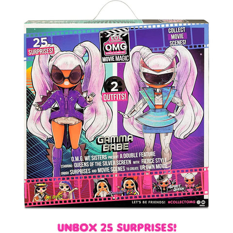 OMG we SISTERS present A DOUBLE FEATURE. Starring: QUEENS OF THE SILVER SCREEN. With: FIERCE STYLE. Unbox SURPRISES and MOVIE SCENES to create UR OWN MOVIE! Introducing Gamma Babe! Unbox 25 surprises including LOL Surprise OMG Movie Magic™ fashion doll Gamma Babe and 3D glasses to reveal additional surprises! Gamma Babe has stunning features and styled hair, and she is articulated for tons of poses. Plus, she's the big sister to fan favorite LOL Surprise characters, Tinz and Glamstronaut. Unbox Gamma Babe's unique movie scene and collect the movie scripts from all 4 Movie Magic™ OMG dolls to complete the story! Dress Gamma Babe in her TWO fierce fashions and fabulous accessories. Pro Tip: Hands are removable for easy dressing. Each doll's packaging is a reusable playset that becomes a Movie Set/Theater. With Gamma Babe, you’ll get 1 LOL Surprise OMG fashion doll, 2 fashion outfits, shoes, accessories, 3D glasses, movie scene, movie script, hat box, hair brush, garment bag, sticker, hanger, doll stand and reusable package playset in an all new unboxing experience. Collect all 4 LOL Surprise OMG Movie Magic™ fashion dolls and create the greatest film the universe has ever seen! Each doll is based on a different movie genre. Aside from Gamma Babe, the LOL Surprise OMG Movie Magic™ series has 3 other fashion dolls - Ms. Direct, Starlette and Spirit Queen. Create and remix your own fierce movies as you unbox each doll's special scene and script! From MGA Entertainment, creators of LOL Surprise dolls, toys and playsets for girls and boys, Rainbow High™ fashion dolls, Na Na Na Surprise dolls, Little Tikes®, Poopsie Slime Surprise girls dolls and many other favorite brands. Collectible doll with doll accessories makes for great birthday gift for kids or gift for any occasion. Perfect for fun, creative and imaginative play for children. WARNING: choking hazard - small parts. Suggested Age: 4 Years and Up