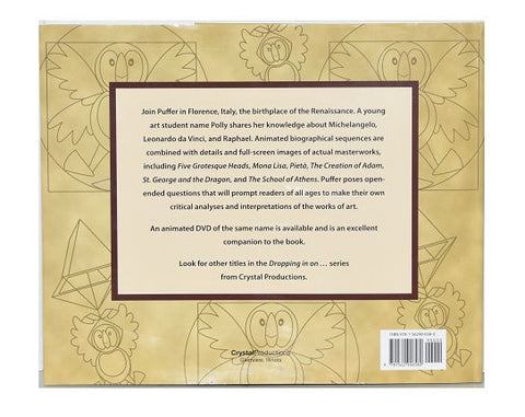 Dropping in on Impressionists is the eighth in a series that introduces children to artists about their lives and artwork. In Dropping in on Impressionists, join Puffer the puffin in a delightful new jaunt into 19th century France, the birthplace of Impressionism. Meet Claude Monet, Mary Cassatt, Edgar Degas, Edouard Manet, Pierre-Auguste Renoir, Camille Pissarro and learn how they came to create an entriely new kind of art. Animated biographical sequences are combined with details and images of masterworks including The Dance Class, The Races at Longchamp, Luncheon of the Boating Party, The Japanese Footbridge, and more.