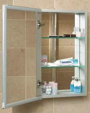 19" bathroom medicine cabinet from Century features an anodized aluminum body to ensure your cabinet will hold up to even the busiest bathroom enviornment for years to come. The mirror finish is inside and out. The soft bumper provides quiet door closure and the wide finger pulls make opening the door easy. Can be surface mounted, recessed, or semi-recessed. Once you have determined your installation method, follow the specific installation instructions for your cabinet system. When surface mounting or semi-recessing, a mirror side kit is necessary (sold separately)