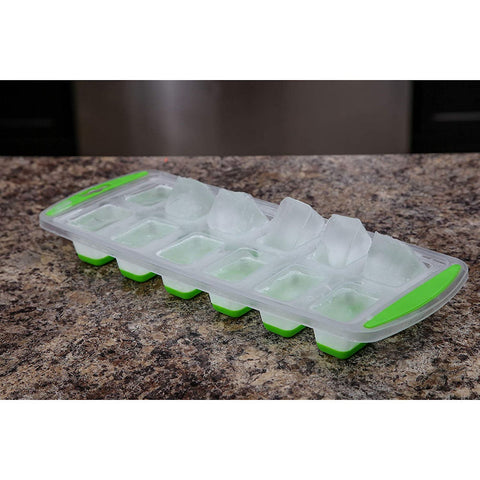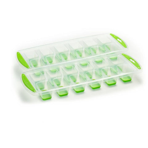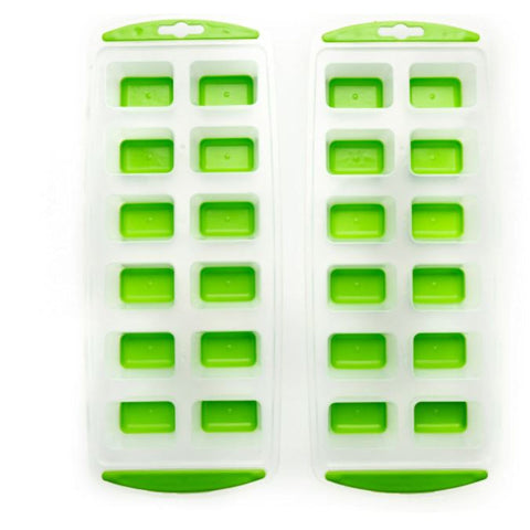 Easily release each cube one at a time with just the touch of a finger. Just flip the tray over, push down on the base and the cubes come right out. This flexible tray features larger capacity one-ounce cubes, 1 3/4" x 1 /1/4" x 1 /1/4. Make 12 cubes on each 13" x 5" 1 1/2 tray. It's made out of plastic and silicon. The tray is top rack dishwasher safe and BPA free. You will receive a set of two trays.