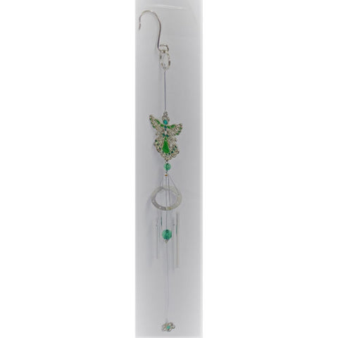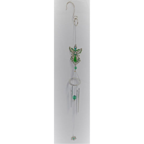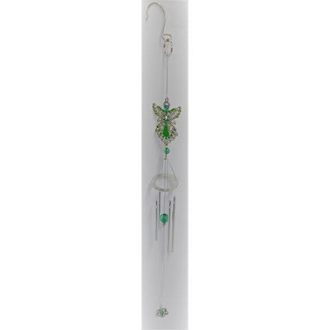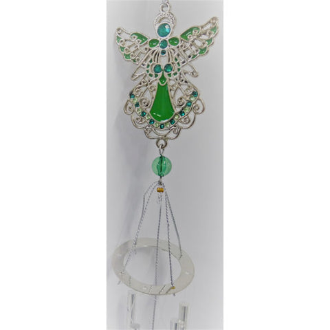 The "May Angel" themed wind chimes comes in silver decorated with colors of green emerald. The wind chimes are made of durable metal and can be used indoor or outdoor. They hang 20 inches.