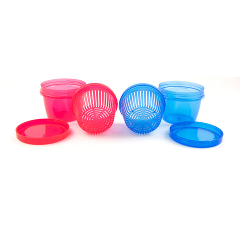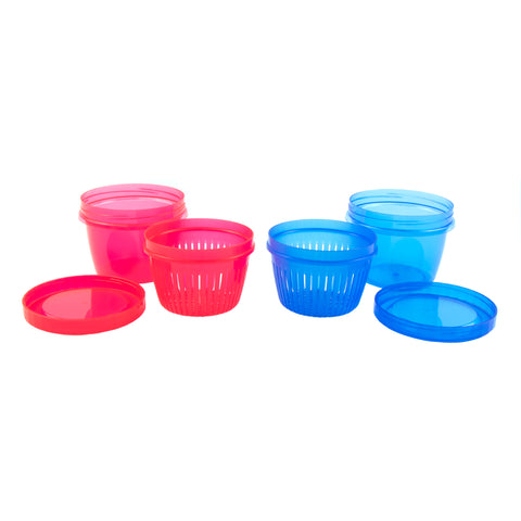 The Berry Bowl is a 3-in-1 wash, serve and store container. The three-piece bowl has a colander for rinsing, bowl for serving, and a lid for storing berries. The colander fits directly into the serving bowl and allows excess water to continually drain, and the lid keeps everything at a humidity that is ideal for the berries when refrigerated, keeping your berries fresher longer. It's ideal for strawberries, raspberries, blueberries, grapes and more. This set includes two Berry Bowls, one red and one blue. The bowls are made from BPA free plastic and are dishwasher safe. Each bowl has a .5 qt capacity and measures 3.5" H x 4" Dia.