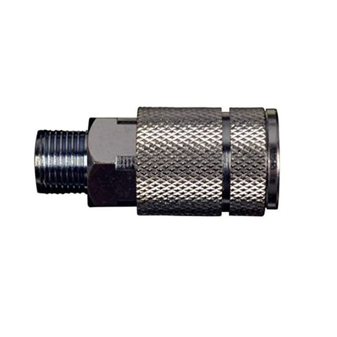 The Campbell Hausfeld 1/4-inch NPT (M) automotive-style coupler (MP602400AV) connects easily to 1/4-inch automotive-style plugs. Made of heat-treated steel with zinc plating to resist corrosion, this high-quality coupler is designed to deliver significantly longer life than brass designs.