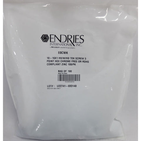 Endries 10-16X1 HX/W/HD Tek Screw 3 Point Hex Chrome Free or Rohs Compliant Zinc 100/pk