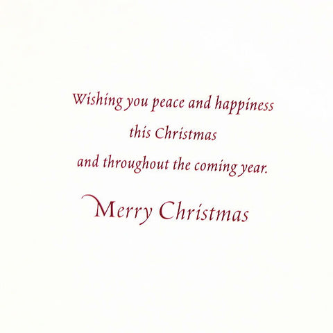 The interior of this Designer Greetings Christmas card design reads: Wishing you peace and happiness this Christmas and throughout the coming year. Merry Christmas. Includes 18 cards (7 7/8" x 5 1/2") and 18 envelopes