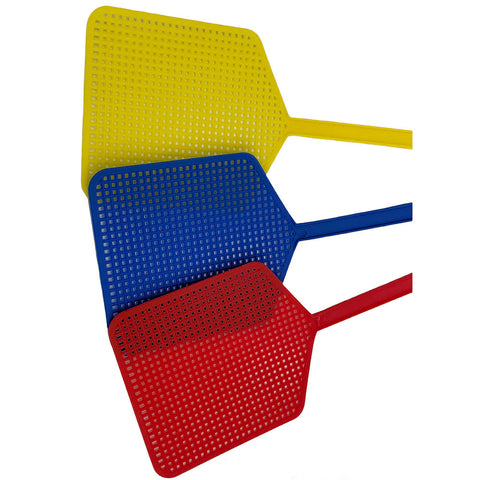 Flyswatters are the environmentally conscious, effective and inexpensive method to control flying insects. Home Smart Flyswatters are made from durable plastic and are properly vented making it easier to hit fast moving flying insects. Great for inside and outdoor, perfect for swatting larger insects - hornets, wasps, carpenter bees, crickets, etc. Dimensions: 18" long. This set includes 3 fly swatters - one red, one yellow, and one blue.