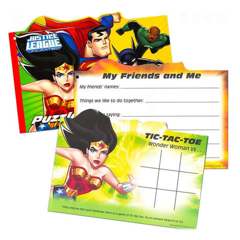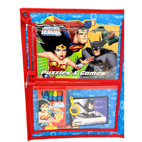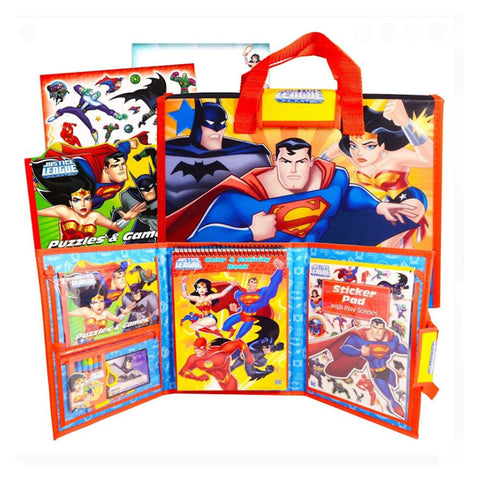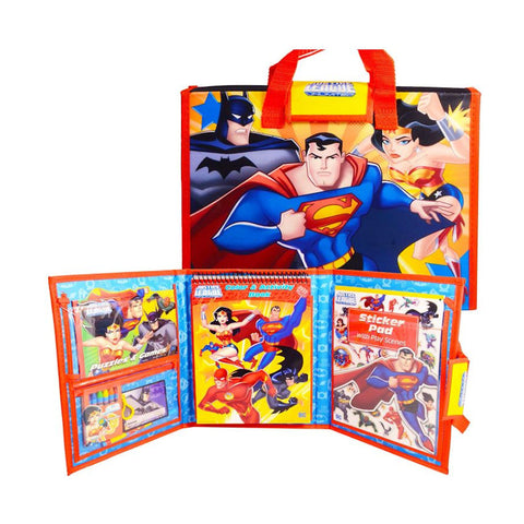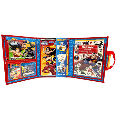 This officially licensed DC Comics Justice League themed activity set will keep your little one creative at home, or on the go! The set comes packaged together in a premium Justice League carrying case that features a tri-fold format and pockets to securely hold the your set together, making this portable and easy to store. The set includes a spiral-bound Justice League coloring and activity book, 6 pack of crayons, marker, puzzle and games book, and sticker pad. The case dimensions closed: 10" L x 13-1/4" W x 1" D. The case dimensions opened: 32" L x 13-1/4" W. Suggested for ages 3 + up.