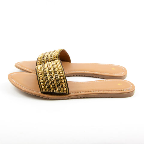 Step into comfort and style with these hand beaded open toe slide sandals from The Skyline Collection. The faux leather upper is a single strap featuring a horizontal hand beaded design in shades of gold. The sandals have a comfortable Memory Foam footbed and non-skid sole. Materials: 100% PU Upper, TPR Outsole. These are a women's size 9 with a 10-1/4" L footbed.